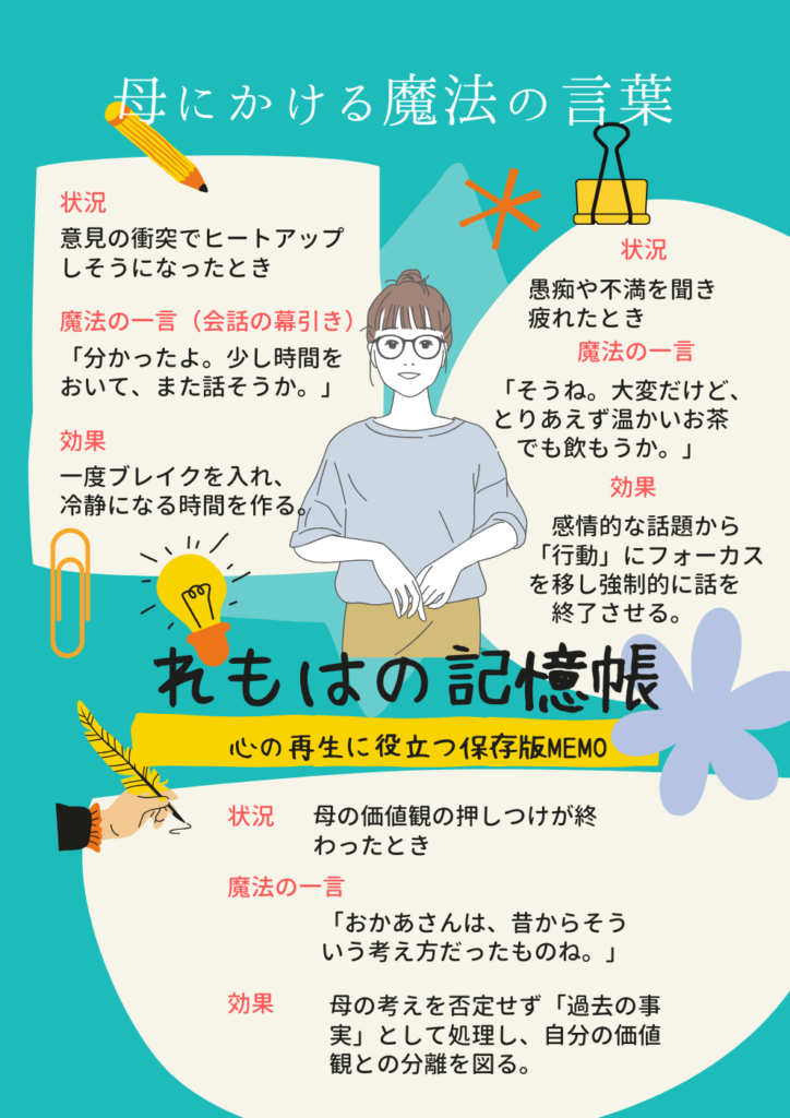 | 母の価値観の押しつけが終わったとき | 「お母さんは、昔からそういう考え方だったものね。」 | 母の考えを否定せず「過去の事実」として処理し、自分の価値観との分離を図る。 |